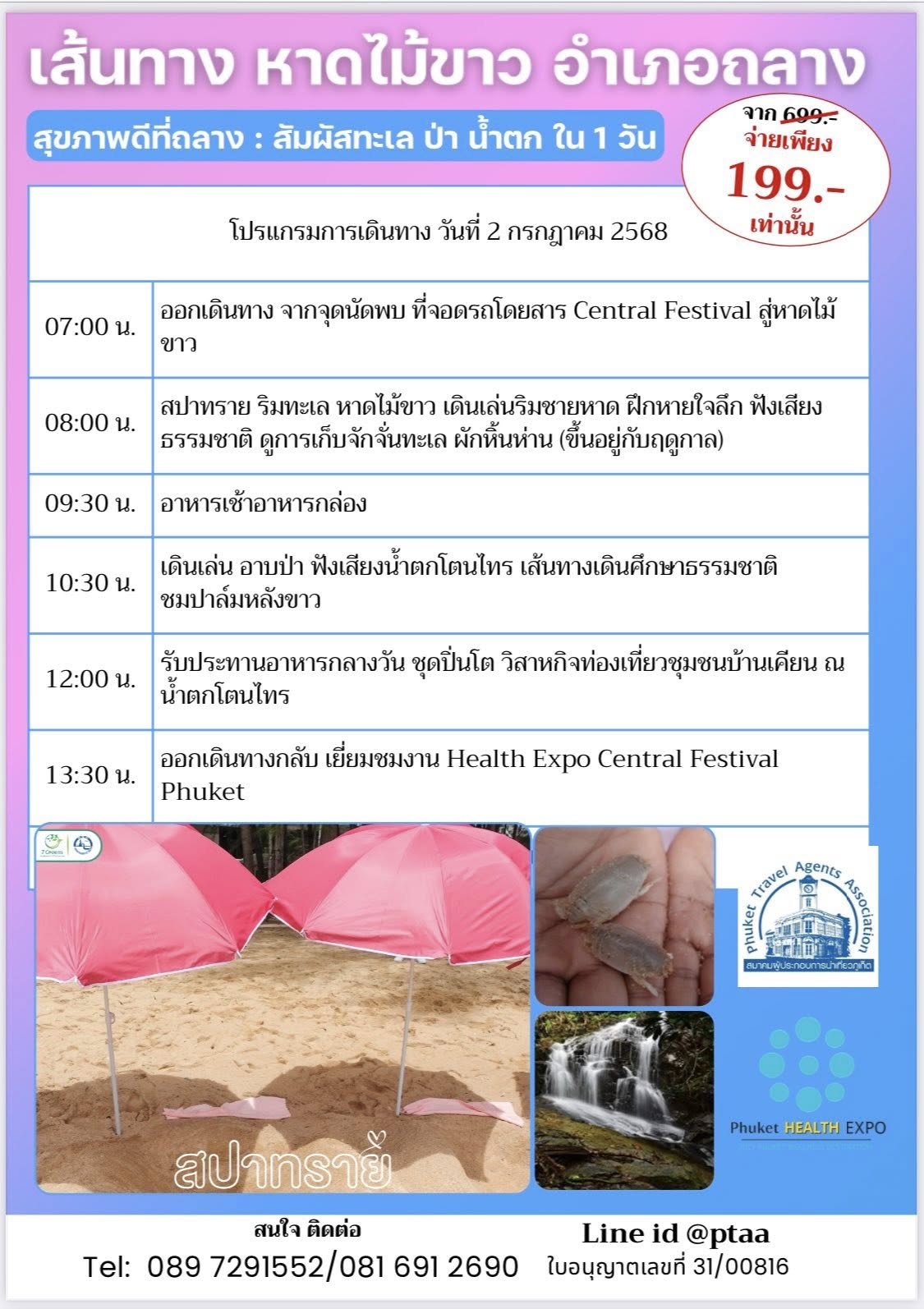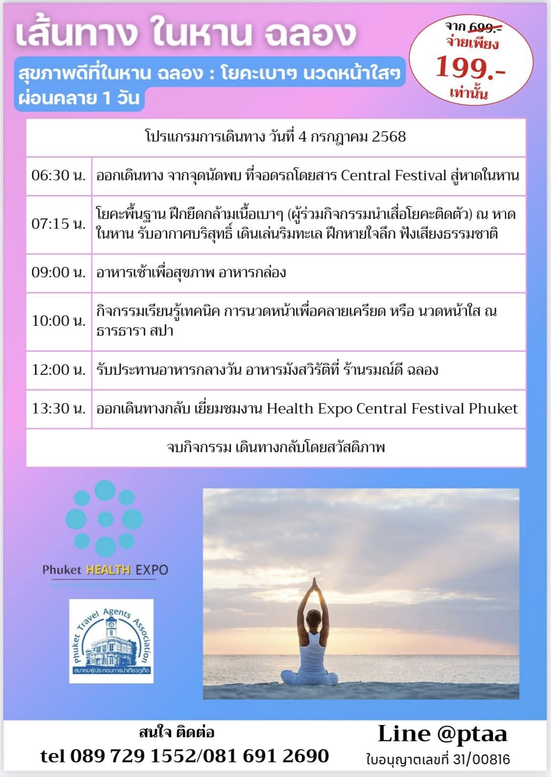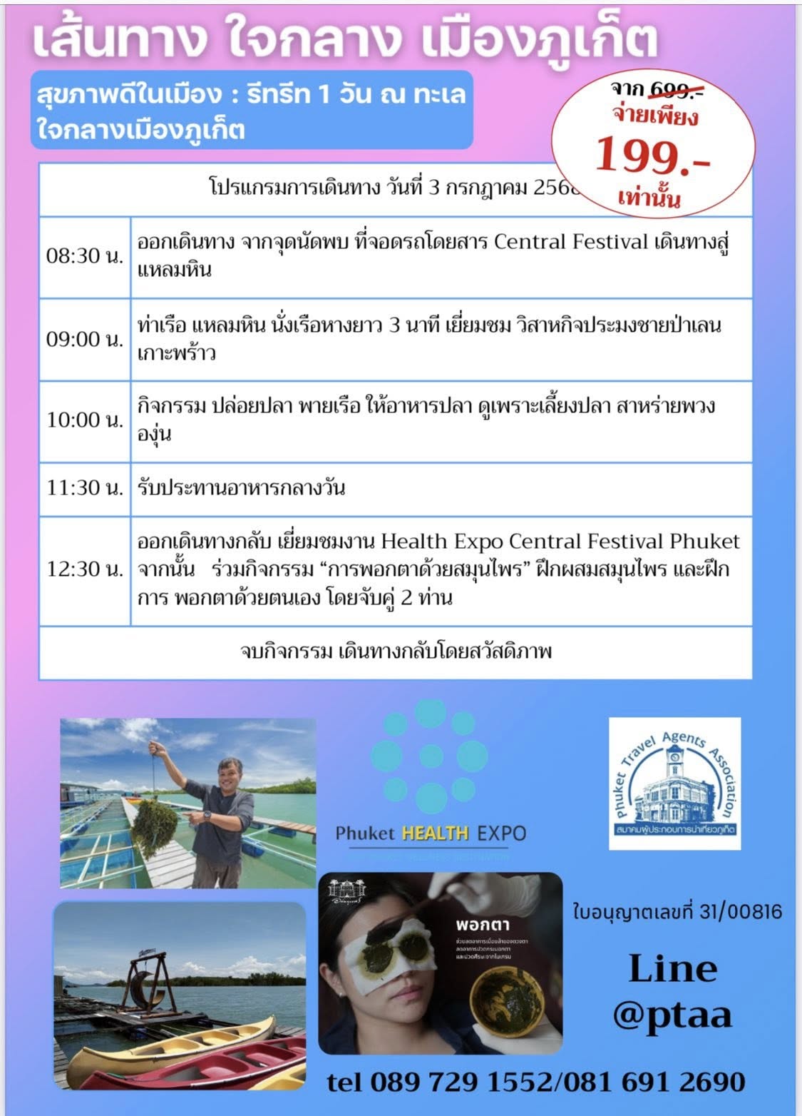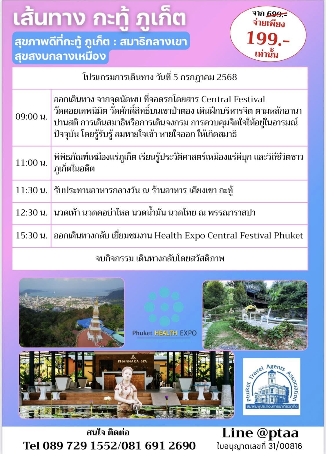 องค์การบริหารส่วนจังหวัดภูเก็ต ร่วมกับสมาคมผู้ประกอบการนำเที่ยวภูเก็ต ขอเชิญชวนพี่น้องชาวภูเก็ตทุกท่านร่วมกิจกรรมพิเศษ “4 เส้นทางแห่งการมีสุขภาพดี” กับกิจกรรมท่องเที่ยวเชิงสุขภาพ 5 ชั่วโมง ที่จะพาทุกคนไปสัมผัสวิถีชีวิตและกิจกรรมเพื่อสุขภาพใกล้บ้านคุณ ในราคาสุดคุ้มเพียง 199 บาท จากราคาปกติ 799 บาท