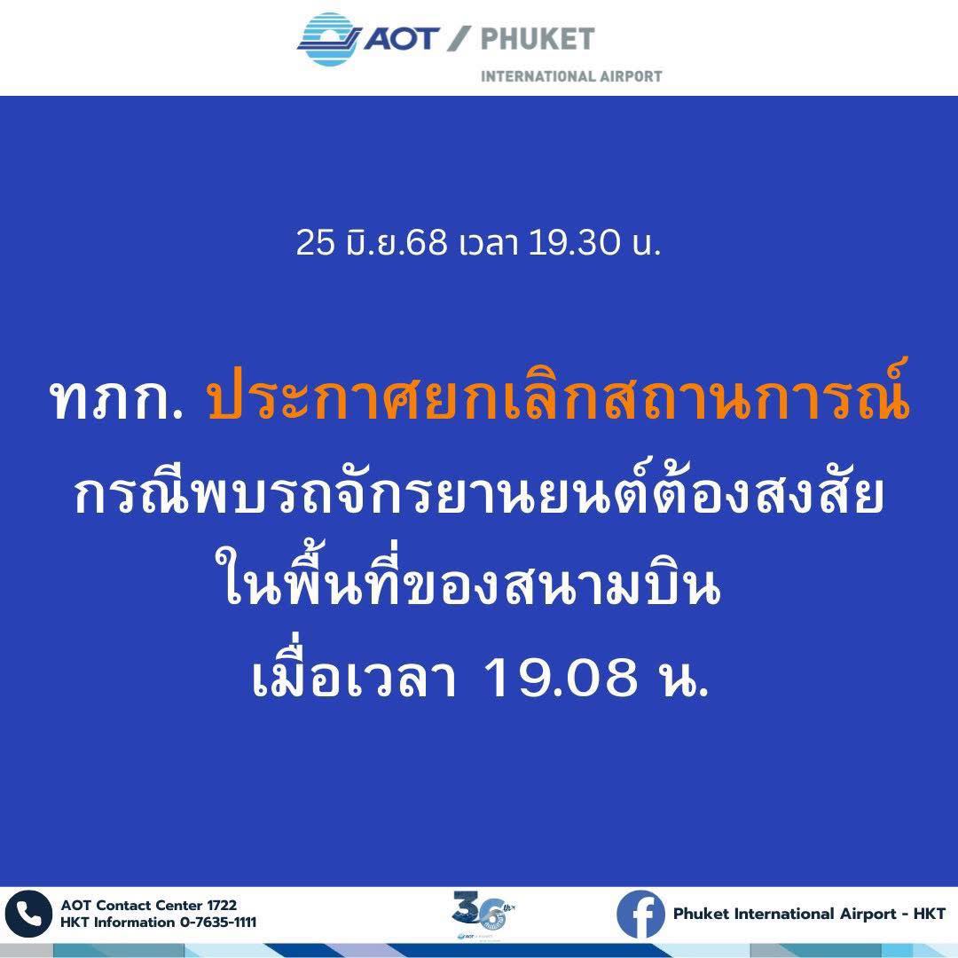 ท่าอากาศยานภูเก็ตเคลียร์วัตถุต้องสงสัย ยืนยันความปลอดภัย-ไม่กระทบการให้บริการ วันที่ 25 มิถุนายน 2568 ศูนย์รักษาความปลอดภัยท่าอากาศยานภูเก็ต ได้รับแจ้งพบรถจักรยานยนต์ต้องสงสัยจำนวน 1 คัน จอดทิ้งไว้บริเวณลานจอดรถจักรยานยนต์ ฝั่งอาคารผู้โดยสารภายในประเทศ ท่าอากาศยานภูเก็ต (ทภก.) โดยก่อนหน้านี้มีรถจักรยานยนต์เข้ามาจอดจำนวน 2 คัน แต่มีการขับออกไปเพียง 1 คัน…