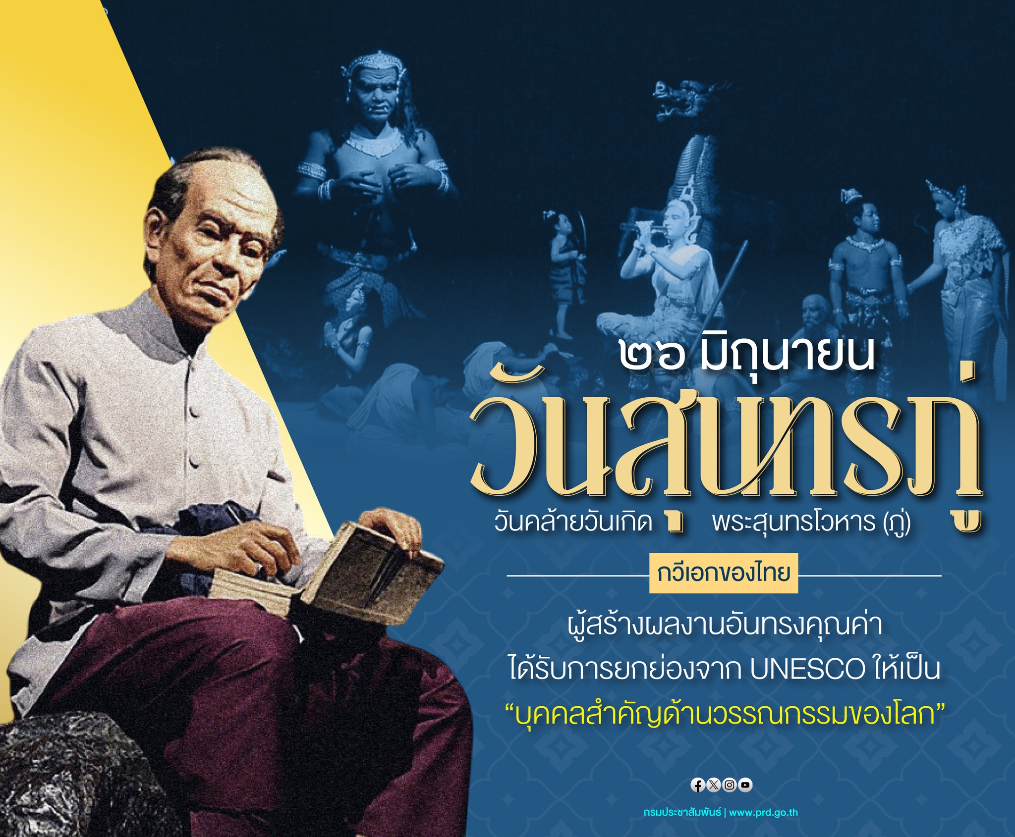 ๒๖ มิถุนายน วันสุนทรภู่ สุนทรภู่ (พระสุนทรโวหาร) ได้รับการยกย่องจากองค์การยูเนสโก (UNESCO) ให้เป็น บุคคลสำคัญของโลก ผู้มีผลงานดีเด่นทางวัฒนธรรม ในปี พ.ศ. 2529 (ค.ศ. 1986) เนื่องในโอกาสครบรอบ 200 ปีชาตกาลของท่าน ทำไมสุนทรภู่จึงเป็น “กวีเอกของโลก”…