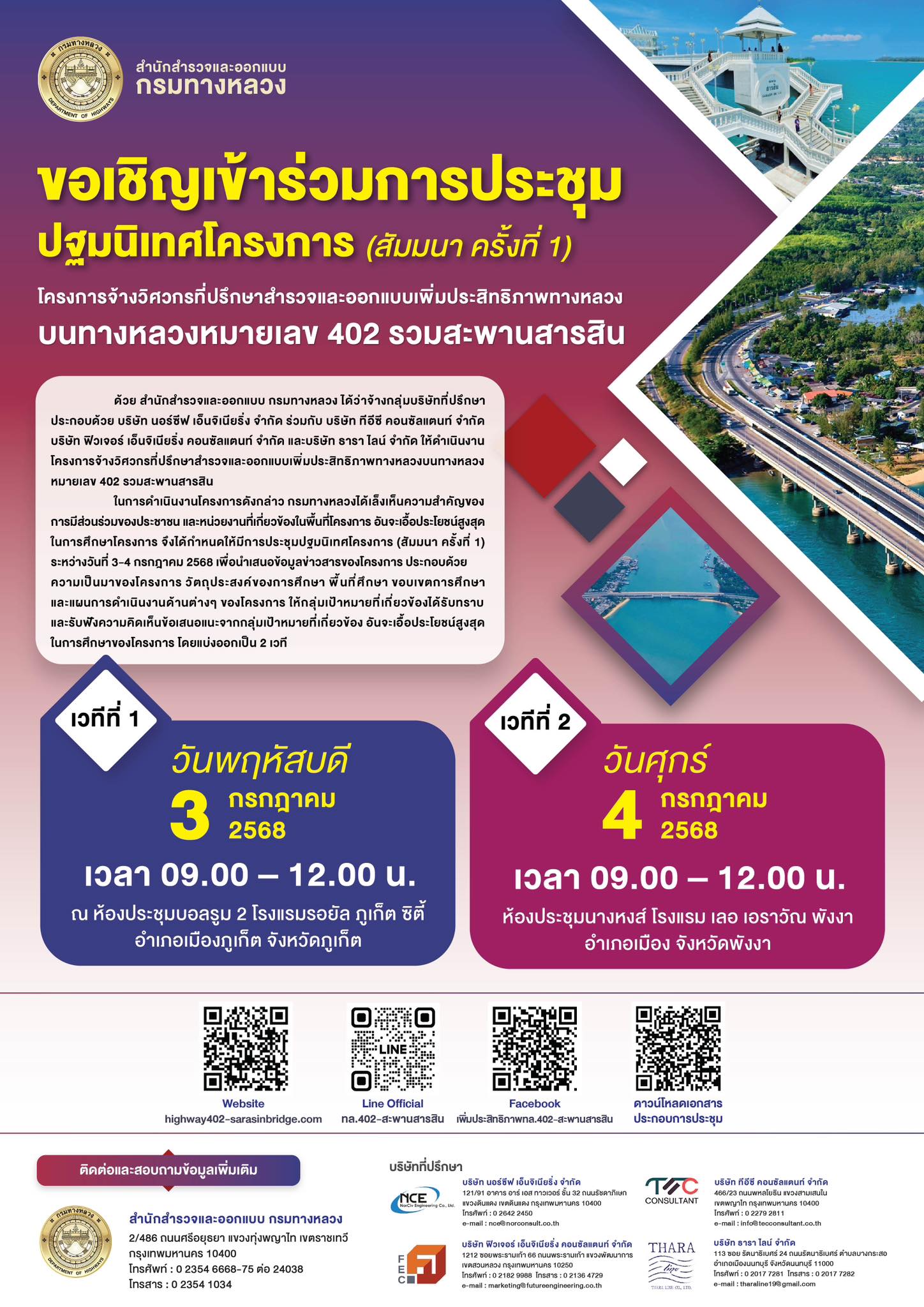 ขอเชิญเข้าร่วมการประชุม ปฐมนิเทศโครงการ (สัมมนา ครั้งที่ 1) โครงการจ้างวิศวกรที่ปรึกษาสำรวจและออกแบบเพิ่มประสิทธิภาพทางหลวงบนทางหลวงหมายเลข 402 รวมสะพานสารสิน