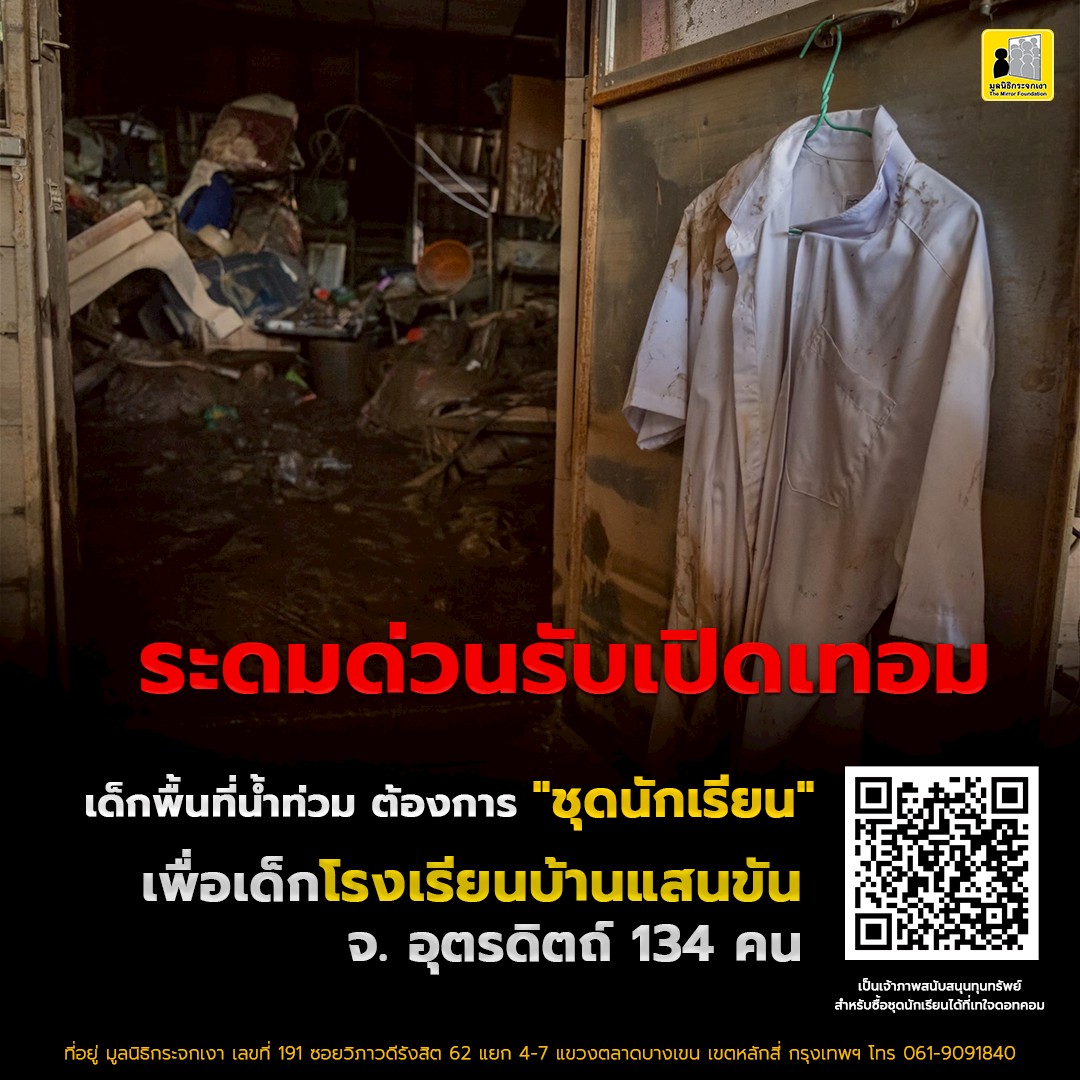 พื้นที่น้ำท่วมนี้มีหลายบ้านที่ชุดนักเรียน อุปกรณ์การเรียนเสียหายจากน้ำท่วม ต้องเริ่มต้นนับหนึ่งใหม่