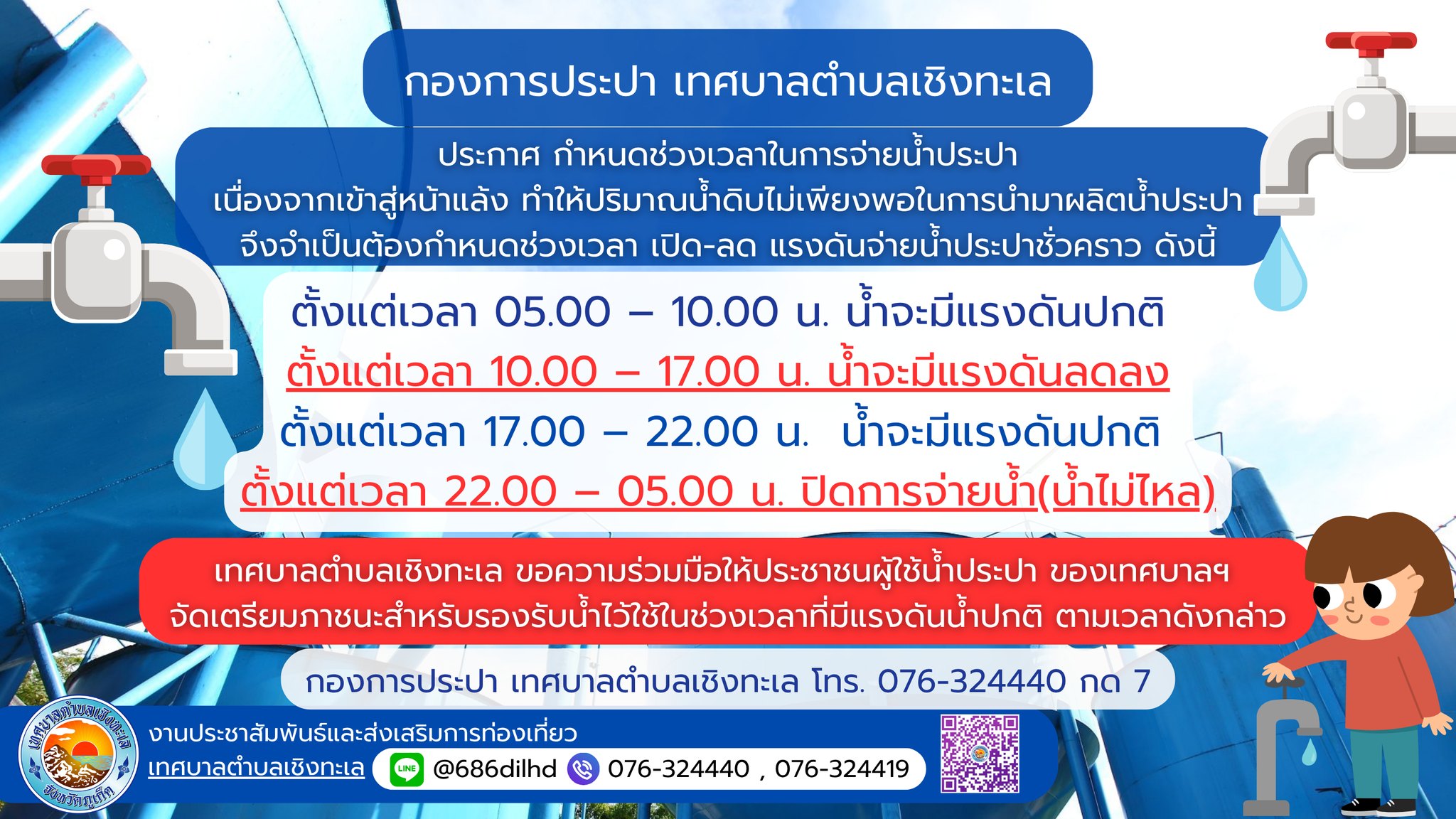 กองการประปา เทศบาลตำบลเชิงทะเล ขอแจ้งว่าเนื่องจากขณะนี้ได้เข้าสู่สถานการณ์ฝนทิ้งช่วงหลายเดือนซึ่งเป็นสถานการณ์ภัยแล้ง ทำให้ปริมาณน้ำดิบไม่เพียงพอในการนำมาผลิตน้ำประปาเพื่อจ่ายน้ำสู่บ้านเรือนของประชาชน จึงจำเป็นต้องกำหนดเวลาการเปิด-ลดแรงดันจ่ายน้ำประปาเป็นการชั่วคราว ดังนี้